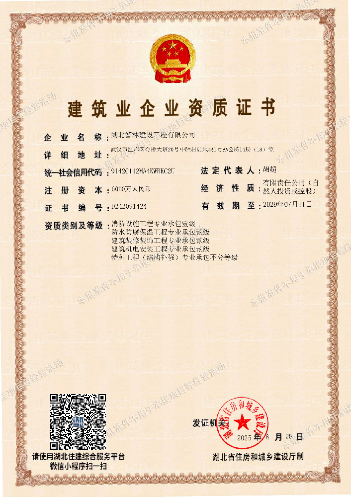 消防设施工程专业承包壹级、防水防腐保温工程专业承包贰级